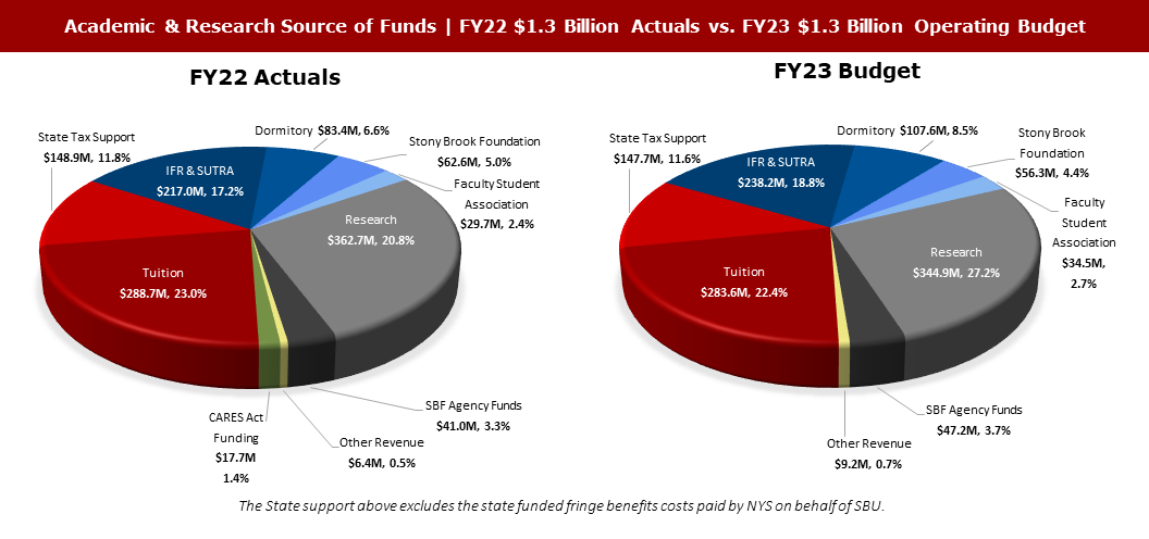 These charts compare Stony Brook University’s actual costs by division during FY22 with budgeted expenses for FY23. Due to the restoration of regular capacity and operations, the university anticipates a change in expenses from $3.71 billion in FY22 to $3.91 billion in the FY23 budget. Roughly half of this planned increase in costs is in the Academic & Research enterprise, which is planned to be $104 million more in FY23 than in FY22.
