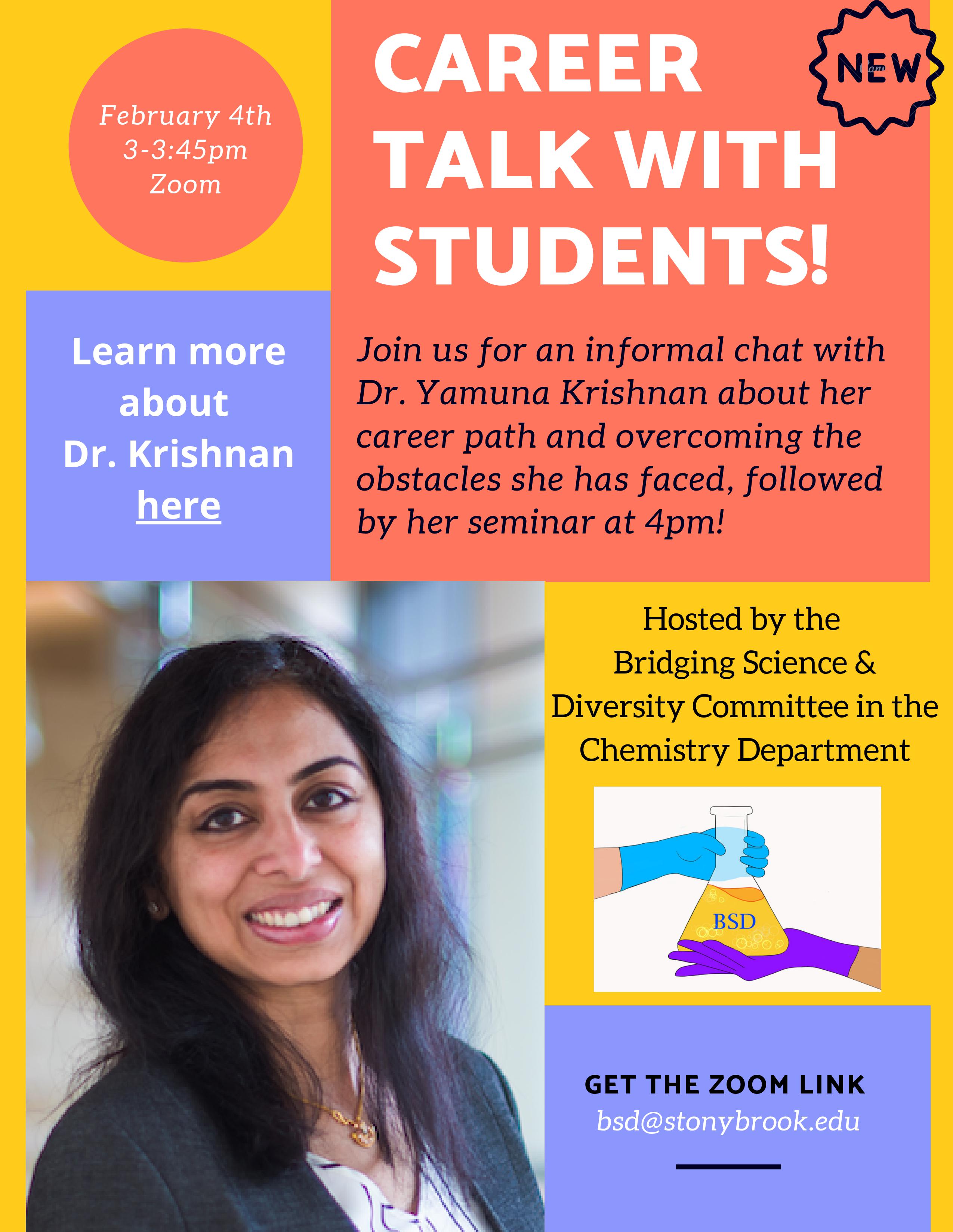 Discussion with Dr Yamuna Krishnan on Feb 4th, 2021 from 3:30-3:45pm for a special chat with graduate students about her career path and personal challenges!