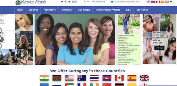 Screenshot of a surrogacy agency website, headquartered in India and offering surrogacy