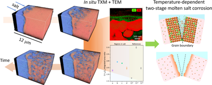 By employing a multimodal approach that utilizes both X-ray synchrotron techniques including X-ray nano-tomography, spectroscopy, and scattering, we can examine the three-dimensional morphology, structure, and chemical composition. This provides insights into the fundamental kinetics and driving forces behind the degradation of molten salts.