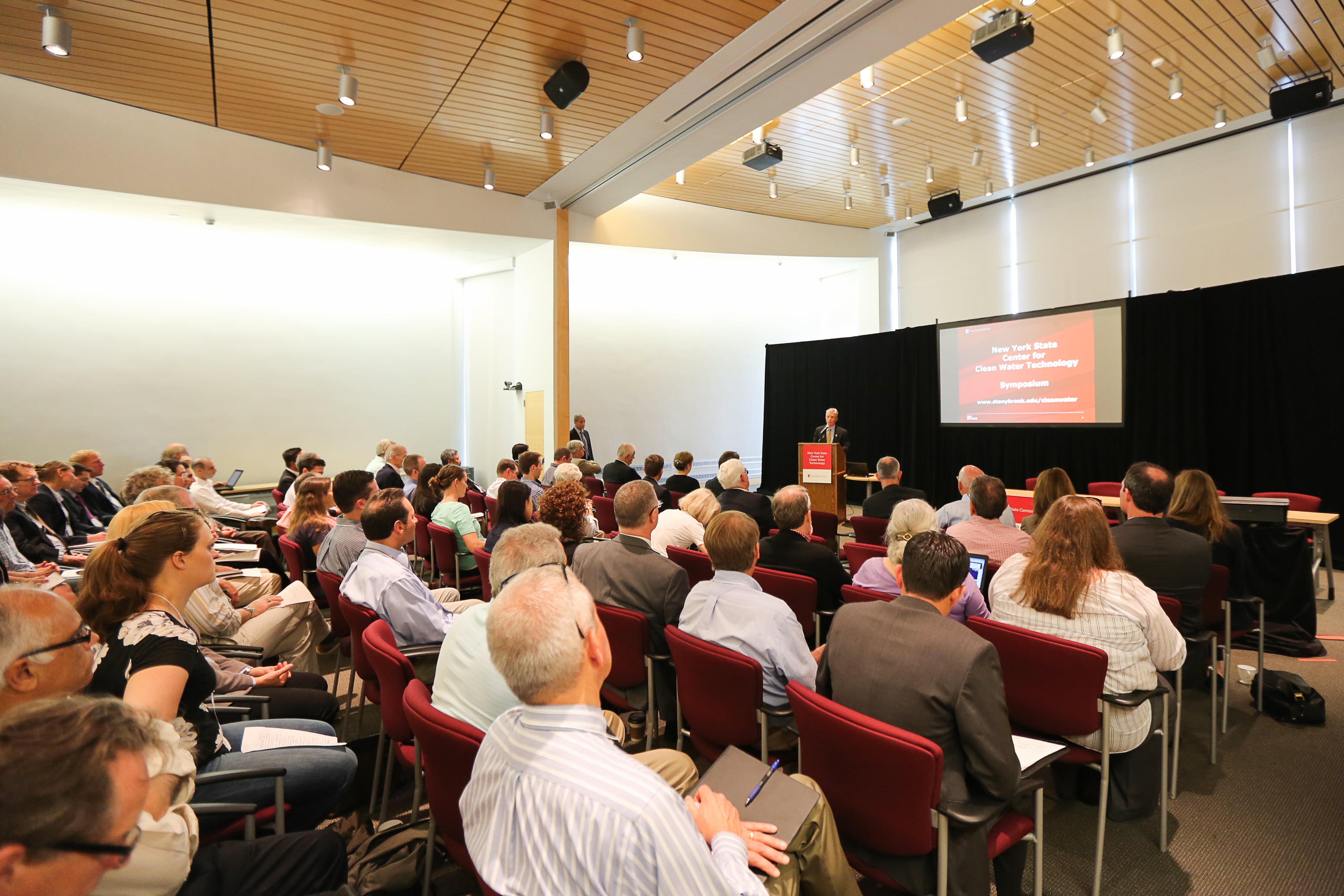 Thursday, June 23rd, Stony Brook, N.Y. – The New York State Center for Clean Water Technology today hosted its first symposium, an event designed to present an overview of the Center’s strategic vision and to showcase the promise of its research investments as it works to develop more cost-effective water quality protection and restoration technologies, focusing first on solutions that remove nitrogen and other contaminants from individual onsite wastewater. The event was attended by more than 100 people representing a wide-range of stakeholders from industry to academia and environmental advocacy, as well as regulators and policy makers from every level of government.