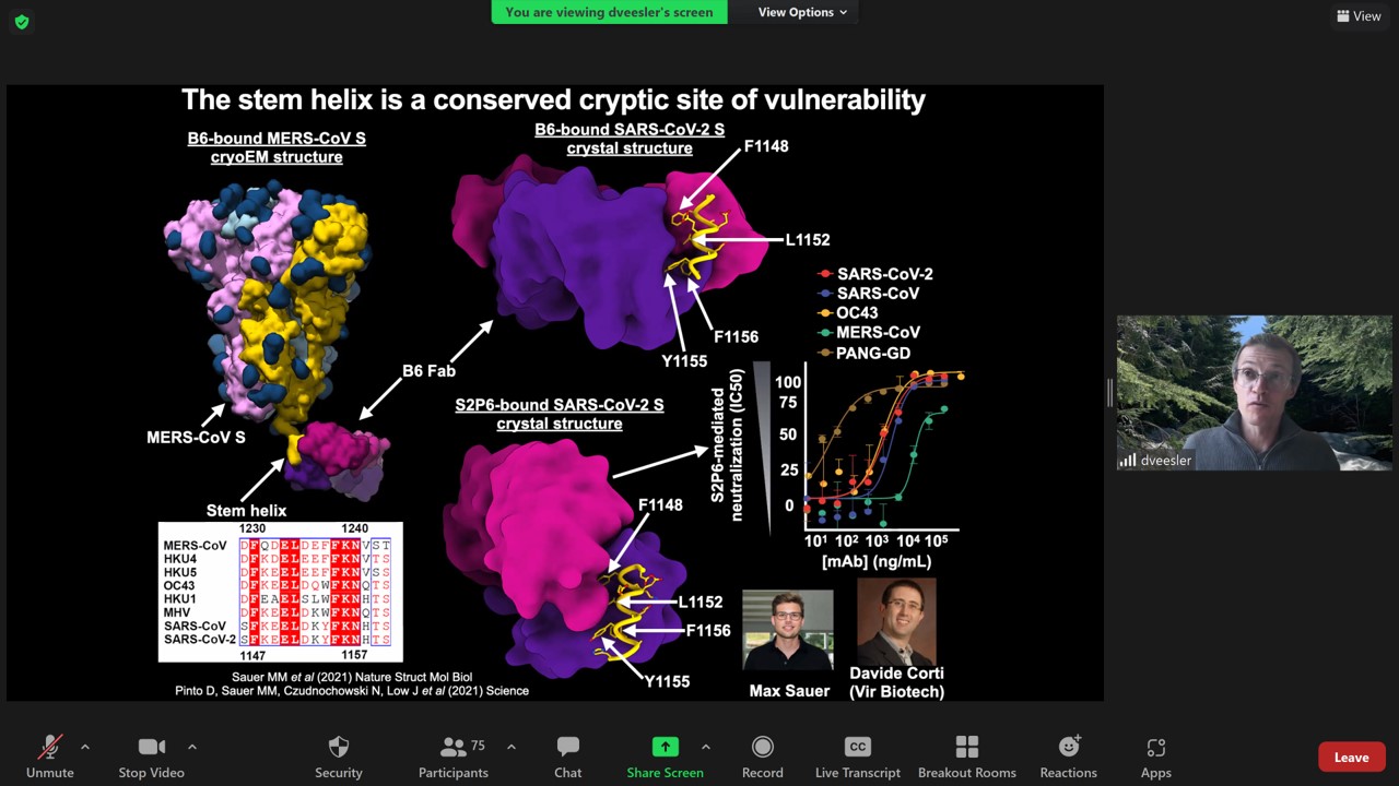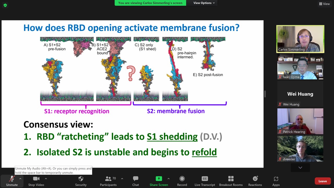 swDr. Patrick Hearing, Professor of Microbiology and Immunology, introduced the first plenary speaker, Dr. Susan Weiss. Dr. Weiss, a Professor of Microbiology at the University of Pennsylvania Perelman School of Medicine, reviewed the coronavirus replication cycle with an emphasis on candidate targets for direct-acting antiviral drugs, and the likely origins of emergent coronaviruses from the late 18th century to the present time in her talk titled “History and Biology of Coronaviruses: What this Teaches Us About Targets for Therapeutics”. Dr. Weiss also reviewed the mutations present in SARS-CoV-2 variants of concern and related these mutations to changes in biological properties of these viruses including immune escape, increased receptor binding, and virus entry.