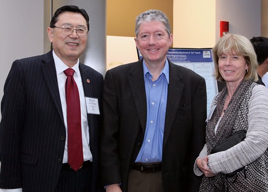 deanDr. Maria Ryan, Professor and Chair of the Symposium Organizing Committee, opened the Symposium and introduced Dr. Kenneth Kaushansky, Senior Vice President of the Health Sciences and Dean, School of Medicine, Stony Brook University. Dean Kaushansky gave very visionary remarks about the accomplishments and advances of the Stony Brook School of Medicine, Hospital and its affiliates. He emphasized that the active participation and collaboration of all clinicians and scientists is vital to make innovative medical breakthrough possible. Dr. Ryan introduced Dr. Iwao Ojima, Distinguished Professor and Director of ICB&DD. Dr. Ojima briefly summarized the accomplishments, current and future goals of the ICB&DD. Dr. Francis Johnson, Professor of Chemistry introduced the first Plenary Lecturer, Dr. Glenn Prestwich, Presidential Professor and Director, Center for Therapeutic Biomaterials and Department of Chemistry, University of Utah. He is a former Stony Brook colleague in chemistry, but also was the Director of the Center for Biotechnology. Dr. Prestwich gave a lecture entitled “From Organic Chemistry to Regenerative Medicine: Realizing the Promise of Translational Research”. He presented how he implemented policies at the University of Utah encouraging faculty and student entrepreneurial activities by describing two case studies for commercialization of university technologies in the areas of regenerative medicine and inflammation modulation. Dr. Richard Lin, Professor of Medicine, introduced the second Plenary Lecturer, Dr. Jeffrey Pessin, the Judy R. and Alfred A. Rosenberg Professorial Chair in Diabetes Research and Director of Diabetes Research Center, Albert Einstein College of Medicine. He is the ex-chair of the Department of Pharmacological Sciences at Stony Brook University. Dr. Pessin gojimaave a very stimulating lecture entitled “Fyn-LKB1 Interaction as a Target for the Treatment of Insulin Resistance and Obesity”, describing how a novel pathway linking the tyrosine kinase Fyn to LKB1 function controls the activity of AMP-activated protein kinase (AMPK). He also highlighted the advantages of targeting the Fyn/LKB1/AMPK pathway for the treatment of metabolic diseases. Dr. Stanley Zucker, Professor of Medicine, introduced the first Invited Speaker, Dr. Lorne Golub, Distinguished Professor, Department of Oral Biology and Pathology, School of Dental Medicine, Stony Brook University. Dr. Golub gave a lecture entitled “From Bench Top to Bedside: The Development of the First FDA-Approved Matrix Metalloproteinase Inhibitor”. He summarized his research on the application of tetracyclines (TCs) into new therapeutic formulations to reduce pathologically excessive connective tissue breakdown, including bone resorption. He is the inventor of Periostat® for the treatment of chronic periodontitis, as well as Oracea® for the treatment of rosacea, a chronic inflammatory skin disease. Dr. Isaac Carrico, Assistant Professor of Chemistry introduced the third Plenary Lecturer, Dr. Barbara Imperiali, Professor, Department of Chemistry, and Massachusetts Institute of Technology. Dr. Imperiali’s lecture was entitled “Fluorescent Tools for Chemical Biology”. She presented her fascinating research on co-translational protein glycosylation and the design and implementation of new chemical probes for the study of complex biological systems. Dr. Stephen Walker, Associate Professor of Oral Biology and Pathology introduced the second Invited Speaker, Dr. Peter Tonge, Professor, Department of Chemistry, Stony Brook University. Dr. Tonge gave a lecture entitled “Slow Onset Inhibitors of Bacterial Fatty Acid Biosynthesis: Drug-Target Residence Time, In Vivo Activity and In Vivo Imaging”. He described his innovative research program on the design, synthesis, and characterization of novel antibacterial agents for treating disease caused by drug resistant bacterial pathogens such as methicillin-resistant Staphylococcus aureus and multidrug-resistant Mycobacterium tuberculosis. Dr. Anil Dhundale, Executive Director, Long Island High Technology Incubator, introduced the fourth Plenary Lecturer, Dr. Harvey Arbit, President, Arbit Consulting, LLC and Adjunct Associate Professor, OVPR Research Integrity and Oversight Programs, Department of Pharmaceutical Care, College of Pharmacy, University of Minnesota. Dr. Arbit presented a lecture entitled “Investigator-Initiated Clinical Trials: Where Do I Start?” His very informative lecture provided a comprehensive view about the IND process and the obligations of an IND sponsor-investigator, with examples of how things can go wrong and the consequences of non-compliance. Dr. Jian Cao, Associate Professor of Medicine, introduced the third Invited Speaker, Dr. Lawrence Hurst, Professor and Chair, Department of Orthopaedics, School of Medicine, Stony Brook University. Dr. Hurst gave a lecture entitled “Development of Xiaflex for Dupuytren’s Disease”. He presented a comprehensive and informative lecture, describing his innovative research on the safe and efficacious use of collagenase treatment in Dupuytren’s disease. He discussed the initial proof of concept and preliminary investigations, leading to the development of injectable clostridial collagenase, which obtained FDA approval recently for the treatment of Dupuytren’s disease. Dr. David Green, Assistant Professor of Applied Mathematics and Statistics, introduced the fifth Plenary Lecturer, Dr. Francisco Villarreal, Professor of Medicine and Co-Director of the San Diego Institutional Research and Academic Care Development Award, Professor for the Future, University of California at San Diego. Dr. Villarreal gave a lecture entitled “Navigating Academia and Technology Transfer Office: The Seeding of a New Biotech Start-up”. He presented his research on the beneficial effects of cocoa flavanols and cardioprotective effects of tetracyclines, which in the past few years led him to file sever