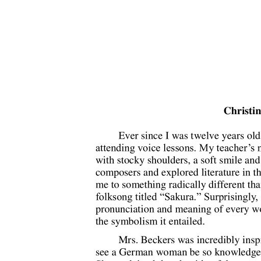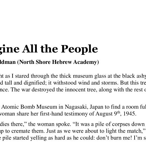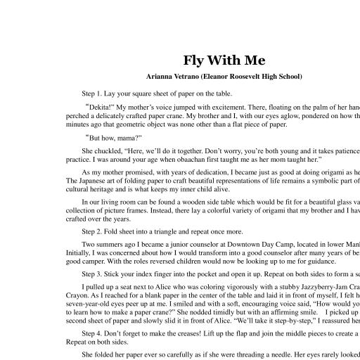 “A Remedy for Loneliness”Tia Culbreath (The Young Women’s Leadership School of Brooklyn)At a young age, I lost both of my parents. Of course, I was too young to fully understand what had happened to them, and why they stopped coming home after those fateful days. But a tiny, itty-bitty pit of loneliness began to form in me. I began to distance myself, making it harder to grow socially as I grew older. I didn't realize I was forming a barrier around myself, keeping people away when I needed them the most. That pit only grew more and more as I deserted my social needs and refused to socialize with other children. I lacked the tools I needed to express myself, to convey my feelings to the people around me. I was desperate for socialization, but allowed fear to keep my tongue still. No one could really understand me. In fact, I couldn't really understand myself at all.