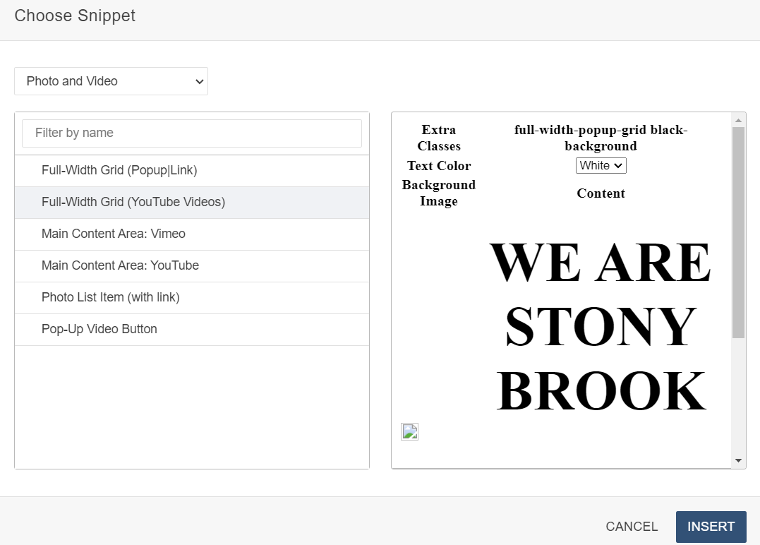 If you are embedding a YouTube or Vimeo video into a main content area, you will select the options for 'Main Content Area: YouTube or Main Content Area: Vimeo.