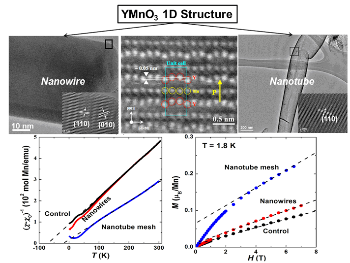 7. Multiferroic materials, such as nanostructured h-YMnO3, are expected to fulfill a crucial role as active components of technological devices, particularly for information storage. Herein, we report on the template mediated sol-gel synthesis of unique one-dimensional nanostructured motifs of hexagonal phase YMnO3, possessing a space group of P63cm. We found that the inherent morphology of the as-obtained h-YMnO3 nanostructureswas directly impacted by the chemical composition of the employed membrane. Specifically, the use of anodic alumina and polycarbonate templates promoted nanotube and nanowire formation, respectively. Isolated polycrystalline nanotubes and single crystalline nanowires possessed diameters of 276 ± 52 nm, composed of 17 nm particulate constituent grains, and 125 ± 21 nm, respectively, with lengths of up to several microns. The structures and compositions of all our as-prepared products were probed by XRD, SEM, HRTEM, EXAFS, XANES, SAED, and far-IR spectroscopy. In the specific case of nanowires, we determined that the growth direction was mainly along the c-axis and that discrete, individual structures gave rise to expected ferroelectric behavior. Overall, our YMnO3 samples evinced the onset of a spin-glass transition at 41 ± 1 K for both templateless bulk control and nanowire samples, but at 26 ± 3 K for nanotubes. Interestingly, only the as-synthesized crystalline nanotubular mesh gave rise to noticeably enhanced magnetic properties (i.e. a higher magnetic moment of 3.0 μB/Mn) as well as a lower spin-glass transition temperature, attributable to a smaller constituent crystallite size. Therefore, this work not only demonstrates our ability to generate viable one-dimensional nanostructures of a significant and commercially relevant metal oxide but also contributes to an understanding of structure-property correlations in these systems.