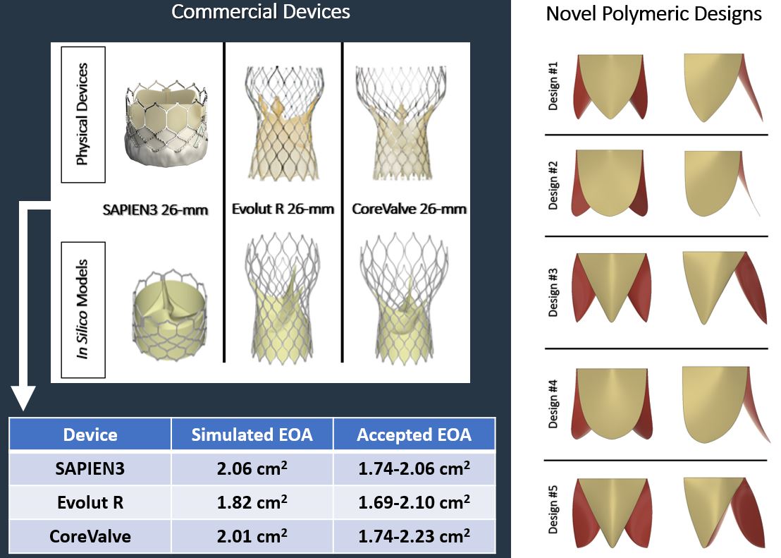 • Virtual commercial TAVR models (26-mm) were generated to match the phsyical devices, while multiple polymeric valve designs (26-mm) were created by varying leaflet attachment and belly curvature
