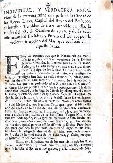 Parallel to this print we were able to find another one corresponding to the earthquake, this time published in Portuguese and published in Lisbon in the same year. For a scientific article, the triangulation of Ulloa's chronicle of the Lima earthquake, the English and Portuguese printings, triangulation referring to the data, the positioning of the authors and the underlying interests, would remain pending. Both texts, the Portuguese and the English version, were scanned.
