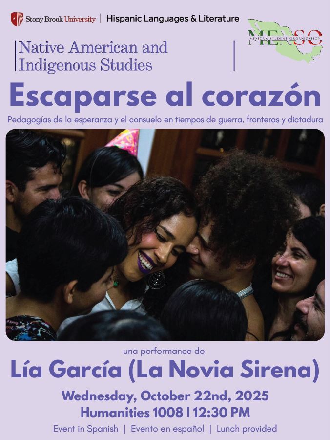 Oct 22 Perfomance by Lía García (La Novia Sirena). "Escaparse al corazón. Pedagogías de la esperanza y el consuelo en tiempos de guerra, fronteras, dictadura". Co-sponsored by NAIS. Wed Oct 22, 12.30 pm in HUM 1008. See poster.