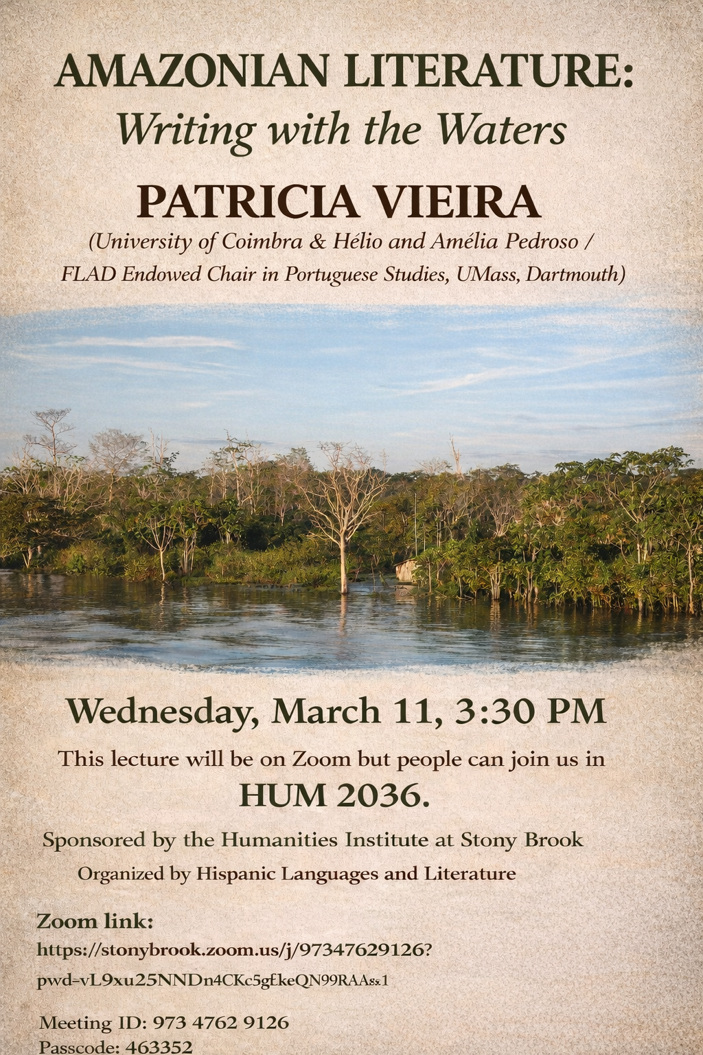 March 11 Lecture by Prof. Patricia Vieira (Univ of Coimbra): ""Amazonian Literature: Writing with the Waters." Wednesday, March 11, from 3:30 to 5:00 pm in TBA. See poster.