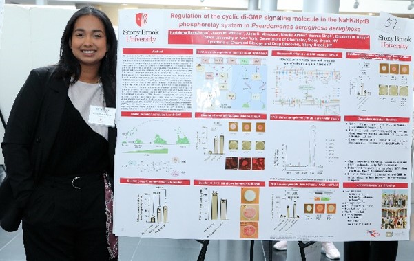 Eighty-three posters were presented in two poster sessions during the symposium, and three posters were selected for outstanding poster awards and presentation in the final session of the symposium. Dr. Anupam Banerjee, Chair of the Poster Session, presented the awards to Xiaowei Bogetti from the laboratory of Dr. Ivet Bahar in the Laufer Center for Physical and Quantitative Biology for her poster titled: “smFRET/DEER-guided Modeling of Protein Conformational Dynamics for Rational Drug Design”.  She was the poster award winner in Computational Biology. Then to Anushka Ojha from the laboratory of Dr. Jingfang Ju in the Department of Pathology, Stony Brook Renaissance School of Medicine for her poster titled: “Beyond 5-FU: Exploring the efficacy of Gemcitabine-modified miRNA-15a in Resistant CRC”.  She was the poster award winner in Medicinal Chemistry. Then to Archana Sudevan from the laboratory of Elizabeth Boon in Department of Chemistry for her poster titled: “NO-Driven Dual Regulation of Nitric Oxide Sensing Protein (NosP) Through Interdependent Cysteine S-Nitrosylation and Heme Binding in Burkholderia thailandensis”.  She was the poster award winner in Structural Biology.  Each of the winners were awarded a check in the amount of $250, an award certificate and all of them were invited to attend the Symposium dinner with the Plenary Lecturers and ICB&DD faculty.