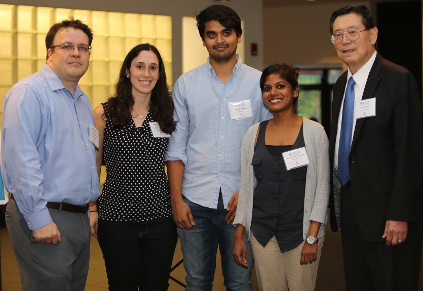 recep 2Fifty seven posters were presented in two poster sessions during the symposium and three posters were selected for Outstanding Poster Awards and presentation in the final session of the symposium. Dr. David Montrose, Chair of the Poster Session, presented the awards to Yu-Ching Chen, a graduate student in the laboratory of Dr. Nicole Sampson, for his poster titled “Deletion of Mycobacterium Tuberculosis melH Epoxide Hydrolase b Interrupts the Electron Transport Chain and Causes Triacylglycerol Accumulation”, Jinal A. Patel, a graduate student in the laboratory of Dr. Hyungjin Kim for his poster titled “Loss of Replisome Integrity by Inducible TIMELESS Degradation Synergizes with ATR Inhibition to Trigger Replication Catastrophe”, and Nivea Pereira de Sa, a postdoctoral research associate in Dr. Maurizio del Poeta’s laboratory, for her poster titled “Structural Basis for Pharmacological Inhibition of Aspergillus Fumigatus Sterylglucosidase A”. Each of the winners was awarded a check in the amount of $250, an award certificate and all of them were invited to attend the Symposium dinner with the Plenary Lecturers and ICB&DD faculty.