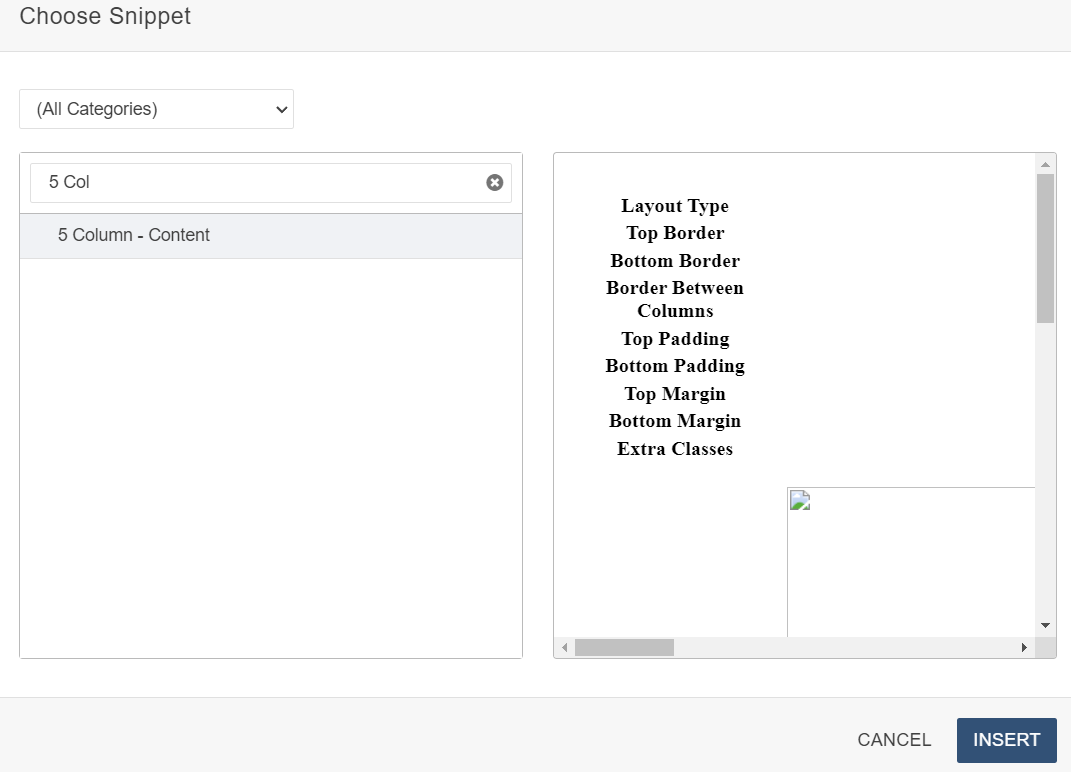 2. Click on category drop down and find "Page Layouts", or simply type in "5 Column Content" or any other option that you want to filter. For example :