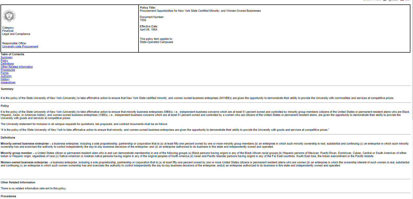SUNY Policy 7557- Participation by Minority Group Members and Women (MWBEs) with Respect to SUNY Contracts