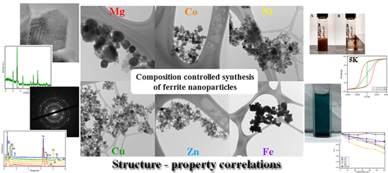 8. The magnetic spinel ferrites, MFe2O4 (wherein ‘M’ = a divalent metal ion such as but not limited to Mn, Co, Zn, and Ni), represent a unique class of magnetic materials in which the rational introduction of different ‘M’s can yield correspondingly unique and interesting magnetic behaviors. Herein we present a generalized hydrothermal method for the synthesis of single-crystalline ferrite nanoparticles with ‘M’ = Mg, Fe, Co, Ni, Cu, and Zn), which can be systematically and efficaciously produced simply by changing the metal precursor. Our protocol can moreover lead to reproducible size control by judicious selection of various surfactants. As such, we have probed the effects of both (i) size and (ii) chemical composition upon the magnetic properties of these nanomaterials using complementary magnetometry and Mössbauer spectroscopy techniques. The structure of the samples was confirmed by atomic PDF analysis of X-ray and electron powder diffraction data as a function of particle size. These materials retain the bulk spinel structure to the smallest size (i.e. 3 nm). In addition, we have explored the catalytic potential of our ferrites as both (a) magnetically recoverable photocatalysts and (b) biological catalysts, and noted that many of our as-prepared ferrite systems evinced intrinsically higher activities as compared with their iron oxide counterparts.